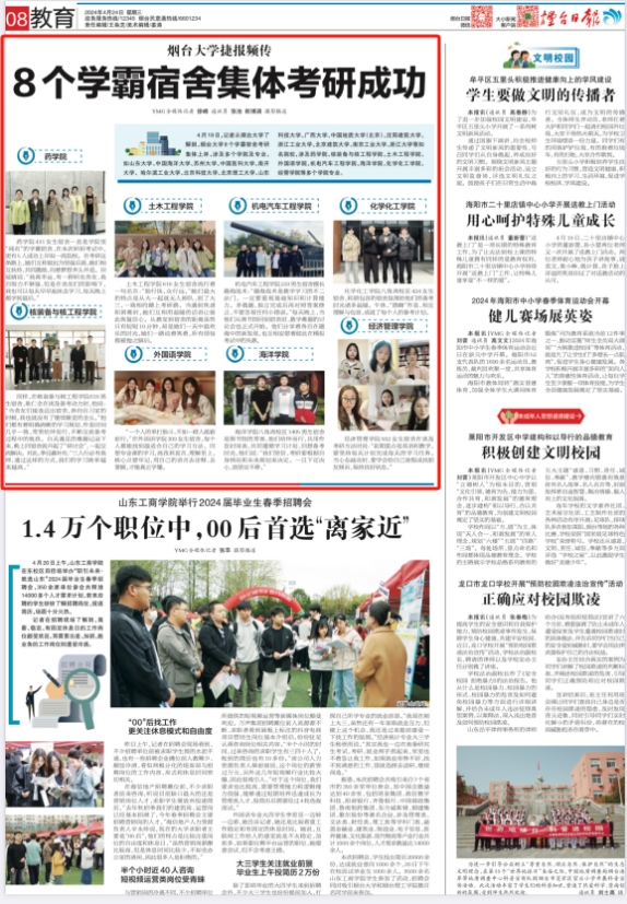 《烟台日报》4月24日08教育版刊发《欧冠官网中文版捷报频传 8个学霸宿舍集体考研成功》