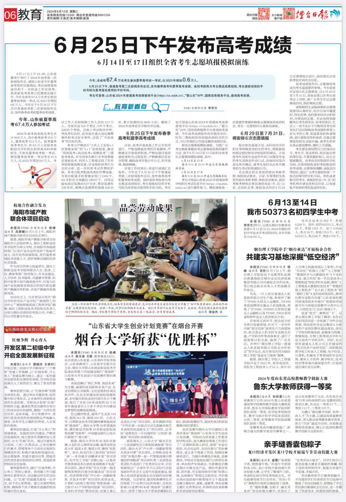《烟台日报》6月12日06教育版刊发《“山东省大学生创业计划竞赛”在烟台开赛 欧冠官网中文版斩获“优胜杯”》