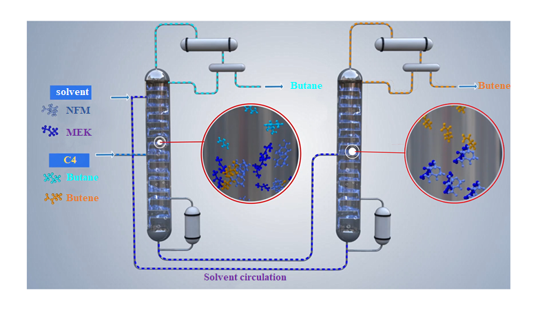 化学化工学院碳四团队在原有碳四分离技术基础之上,开展了相关节能技术研究。团队将络合萃取及加入到常规碳四分离萃取剂中,对混合碳四加盐络合萃取精馏过程进行了系统研究。结果表明,加入络合萃取剂可显著提高混合碳四组分间的相对挥发度,加盐络合萃取精馏工艺比传统萃取精馏工艺节能30%以上,该研究为碳四分离提供了一条高效节能的新途径。