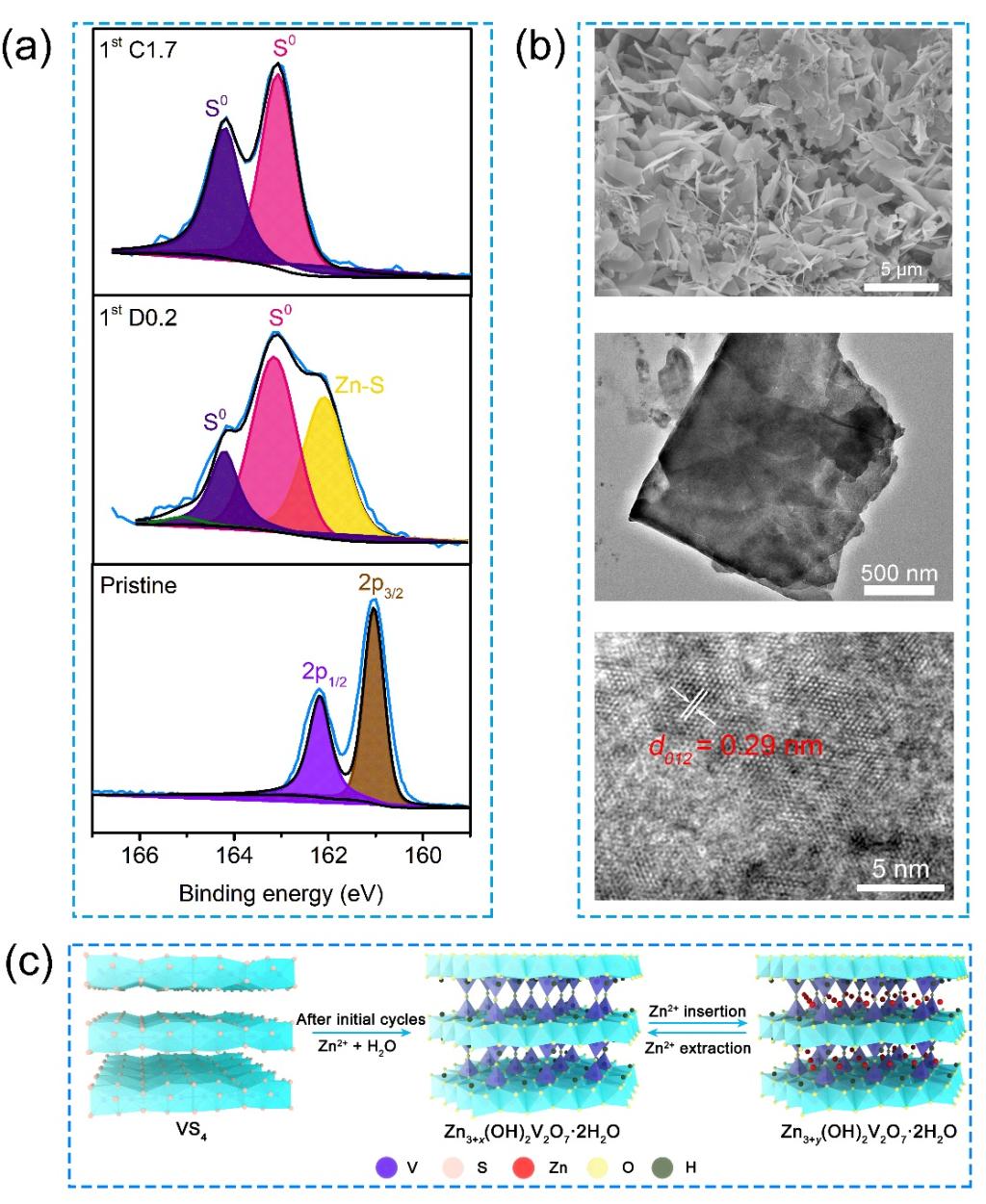 图1.(a)S 2p非原位XPS,(b)VS4/CNTs电极循环300圈之后的形貌图,(c)VS4/CNTs电极在循环过程中的反应机理示意图。