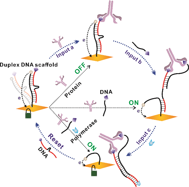 近日,化学化工学院刘树峰教授团队基于标记的双链DNA骨架,设计得到了一种简便、通用的电化学传感分析研究界面,可实现目标蛋白质的多种信号响应模式检测;并可用于目标蛋白绑定信息的连续监测。进一步,基于该传感界面上的串级“与门”逻辑操作,构筑得到了一种可重置、电信号响应的分子键盘锁,进行生物分子逻辑运算。所构筑的传感分析平台具有设计及操作简单、信号输出灵活可控、检测灵敏度及选择性好、以及可扩展的逻辑运算功能等优势。