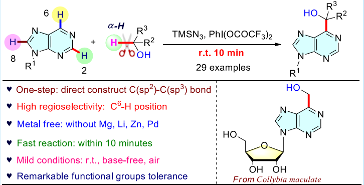 鉴于嘌呤和嘌呤核苷化合物的重要生物活性,近日,我校化学化工学院孙凯课题组和鲁东大学于明武老师团队合作,利用PIDA/TMSN3氢原子转移体系,共同开发了一种高度区域选择性的羟烷基化反应,在10分钟内可以合成系列C6-羟基烷基化嘌呤和嘌呤核苷。该研究成果发表于美国化学会的有机快报(Org. Lett., 2022, DOI:10.1021/acs.orglett.2c01680)。