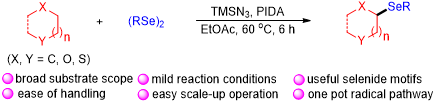 含硒杂环化合物具有重要的生物和药理活性,在抗菌、抗肿瘤、心血管保护及免疫调节方面具有的重要作用。近日,我校化学化工学院有机方法学团队,孙凯课题组利用PIDA/TMSN3氢原子转移体系,成功实现了醚类化合物惰性C(sp3)-H的硒化反应,制备了系列结构多样性的不对成硒醚化合物(Chem. Commun., 2022, 58, 1526)。孙凯为通讯作者,欧冠官网中文版为第一单位;该研究得到了国家自然科学基金、欧冠官网中文版拔尖人才计划的资助。