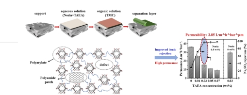 近日,我校化学化工学院赵玉潮教授课题组利用大环分子作为主体构建单元,基于界面聚合反应,通过“打补丁”策略制备了聚芳酯-聚酰胺复合纳滤膜。大环分子内部空腔有效降低了水分子传质阻力,纳滤膜渗透率达2.85 L·m−2·h−1·bar−1·μm,硫酸钠截留率高于96%,且具有优良的耐压性和长期稳定性。