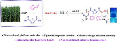近日,我校化学化工学院秦玉升教授课题组利用糠醛生物基单体参与的Ugi多组分聚合反应高效制备了一系列结构可控的生物基聚酰胺。该反应具有无需催化剂、聚合条件温和、反应原子经济性高的突出优势,并展示出了非传统发光特性。该团队针对糠醛基聚酰胺结构设计成功实现了产物的荧光可控,并对其应用进行了探索。本研究为多组分聚合产物应用提供了新的方向,也为聚酰胺荧光发光机制的研究提供了新思路。