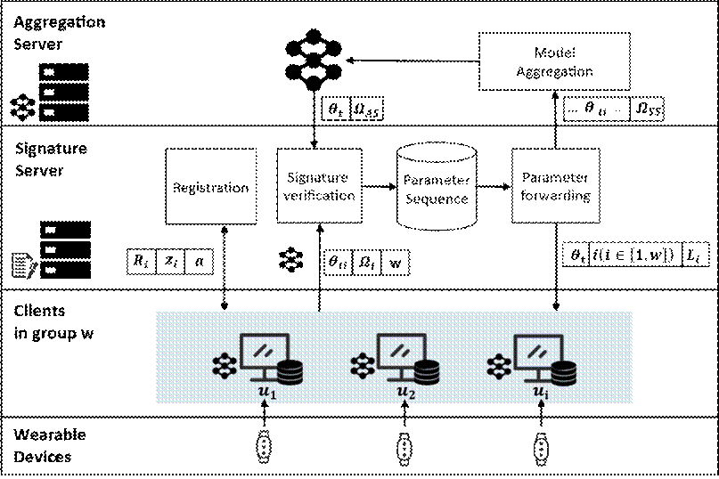 该论文针对智慧医疗领域隐私泄露和安全问题进行了分析研究,提出了基于环签名技术和联邦学习的智慧医疗系统架构。在系统中,人体生理指标由可穿戴设备采集,利用边缘计算设备进行本地训练,模型参数上传至中心服务器进行疾病预测。在此过程中,系统使用无证书环签名隐藏数据来源,可以有效抵抗源推理攻击;所提出的签名批量验证算法能够大大降低服务器的计算负载,使得基于可穿戴设备的智慧医疗系统能够大规模部署实施。