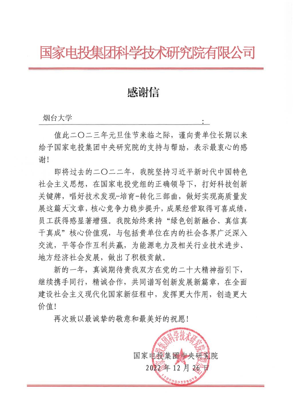 近日,欧冠官网中文版收到了一封来自国家电投集团中央研究院的感谢信。