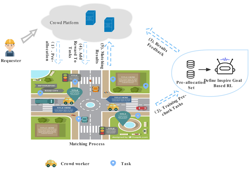 系列成果以物联网(IoT)快速发展和5G网络快速普及背景下的移动众包(MCS)为研究对象,对其中的关键环节——任务分配如何在有限的预算下尽可能提高任务完成率展开研究。该成果首先针对请求者预定任务执行和工人在线的场景,提出一种基于时间和位置约束的任务预分配方法(ORTA),在优化模型(OPTA)的基础上,筛选出预离开任务集。其次,提出基于Q-learning算法的激励机制,确定预离开目标任务并对其增加报酬,激励众包工人参与任务,从而提高任务完成率。最后,通过在真实数据集上的对比实验验证了提出方法的性能。图1为系统总体框架图。