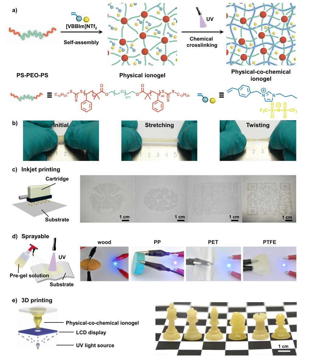 目前,新型柔性电子器件的发展趋向于结构复杂化、定制化,作为其中的重要材料,离子凝胶的结构性能和可加工性是实现这一目标的关键。然而,目前制备高性能离子凝胶的方法,如引入双网络或非共价交联等,通常基于常规的加工成型方法得到块体凝胶,不利于在定制化器件中的应用。设计制备兼具优异的机械性能以及灵活的可加工性的高性能离子凝胶仍然是一项重大挑战。