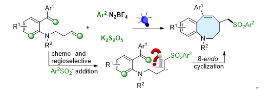N-杂环化合物是合成和医药化学中常见的分子骨架,在世界销售排名前100的药物分子中,含氮杂环占比接近一半。因此,N-杂环的有效构建一直是有机合成研究的热门领域。目前,采用可见光诱导自由基加成环化制备8-/9-元氮杂中环的方法尚无报道。近日,我校化学化工学院有机方法学团队,孙凯课题组利用可见光诱导自由基串联环化策略,成功完成了8-/9-元氮杂环的构建工作,并通过DFT计算验证了反应路径的合理性,解释了反应过程中其他竞争反应的不可行性。