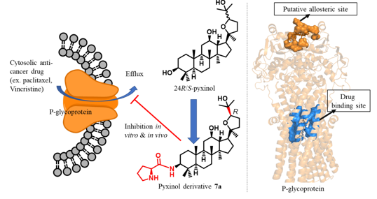 本团队以人参皂苷在人肝脏中的主要活性代谢产物——pyxinol为母核结构基础,以化学生物学和药物分子设计合成为主要研究方向,针对肿瘤多药耐药的P-糖蛋白靶点,构建了系列高活性抑制剂,并利用P-糖蛋白N端的潜在变构位点进行虚拟筛选,然后在蛋白分子水平、细胞水平及动物进行了确证。该研究将有力引导并推动P-糖蛋白非底物型变构抑制剂的研究与开发,为新型肿瘤多药耐药逆转剂的发现,提供了一种全新的策略。