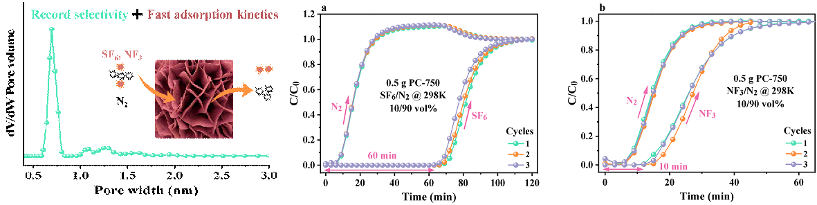 欧冠官网中文版徐秀峰教授课题组较早开展了SF6、NF3等新型温室气体的减排研究,利用化学分解方法(催化水解或无水分解)将这些气体转化为低害物质。相比之下,将SF6、NF3从工业废气中吸附分离并回收再利用是一种更有效的资源化处理方法。为此,本课题组以柠檬酸钾为原料,经一步碳化活化,调控纳米片状炭基吸附剂的孔结构和表面性质,增强了吸附剂与SF6、NF3分子的相互作用,提高了吸附剂在常温常压下对SF6的吸附量(4.09 mmol·g-1)和吸附选择性(10%SF6/90%N2的分离比436.4),对10%NF3/90%N2的分离比达到61.4,优于文献报道的吸附剂。研究结果以“Highly-efficient separation of SF6/N2and NF3/N2with record selectivity on one-step synthesized carbon nanosheet”为题,发表在化工分离领域权威期刊《Separation and Purification Technology》。作为资源化减排SF6、NF3废气的一种有效方法,该工作丰富了对吸附分离含氟温室气体科学规律的认识。