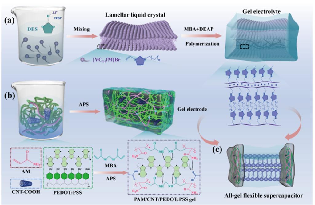 近日,欧冠官网中文版化学化工学院科研人员发表研究成果:一种有序离子液晶电解质并用于全柔性超级电容器的构筑。将两亲性离子液体和低共熔溶剂的独特性质与液晶中高度有序的微观结构相结合,即以无序的离子液体作为组装基元,在低共熔溶剂介质中通过自组装形成有序的液晶结构,选择具有高度取向结构的层状液晶作为基体,通过光引发聚合交联,将液晶的取向结构锁定,进而成功制得具有取向结构的凝胶电解质,其中相分离产生的亲水层或离子层形成界限清晰的离子通道,实现了离子的快速传输。无需使用额外的可伸缩衬底或隔膜,与凝胶电极组装形成全凝胶柔性器件,极大减弱了电极与电解质的界面电阻。这种新颖的结构组成、简单的构筑方法、稳定的机械性能以及优良的电化学性能使柔性超级电容器具有真正可穿戴应用的前景。