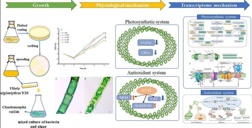 近年来,该团队对我国北方养殖区域和潟湖出现的一种绿藻外来种——强壮硬毛藻的入侵暴发机制、生态效应、防控方法以及综合利用等方面开展系统全面的研究,并多次获得国家自然科学基金项目资助。最近,研究发现了对入侵绿潮藻-强壮硬毛藻具有良好抑制效果的一种新溶藻菌,摸清了溶藻菌抑制剂量和抑制条件,并从整体水平、个体水平、细胞水平、分子水平上分别探究了抑制作用机制。相关研究成果不仅丰富菌藻相互作用机制的认知,而且有望为生物防控绿潮藻的生长和扩散提供新的思路和方法,同时强调了进一步关注入侵藻的必要性,并为保护海洋生物多样性、可持续环境发展和恢复蓝碳生态系统提供参考。