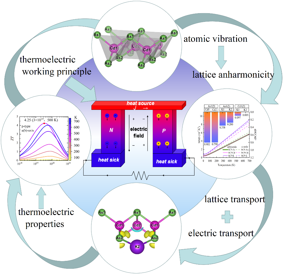 热电材料具有直接将热能转化为电能的能力,适用于从废热回收、太阳能电池革新到航空航天等众多领域。因此,寻找具有本征高热电性能的母体材料一直是人们所追求的方向。近日,欧冠官网中文版物理与电子信息学院的戴振宏教授和赵银昌教授课题组联合清华大学倪军教授课题组在国际知名期刊《Energy & Environmental Materials》(五年影响因子16.5)上发表了题为“Effects of rattling behavior of K and Cd atoms along different directions in anisotropic KCdAs on lattice thermal transport and thermoelectric properties”的研究论文,文中报道了KCdAs的独特各项异性热电输运性质,指出KCdAs是一种极具潜力的热电候选材料,为设计新一代热电器件奠定了可靠理论基础和技术指导。