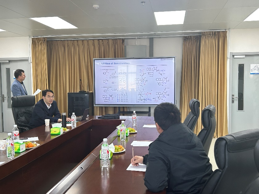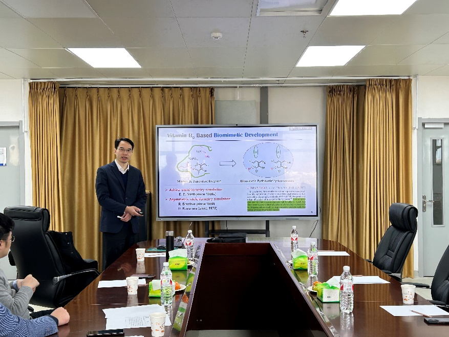赵宝国教授做了提为“基于维生素B6的仿生不对称催化”的学术报告。针对基于维生素B6的仿生催化反应的发展历程、目前面临的问题、团队近年来的探索三个方面进行了分享。重点介绍了基于辅酶维生素B6的骨架发展的多种手性吡哆醛、吡哆胺催化体系。以手性吡哆醛/吡哆胺为催化剂,实现了羰基仿生不对称转氨化,以极高对映选择性合成了各种α-氨基酸、多肽和三氟甲基胺等手性胺类化合物。并对反应的探索过程进行了详细分享。报告结束后,赵宝国教授与在场师生展开探讨交流,现场气氛热烈活跃。