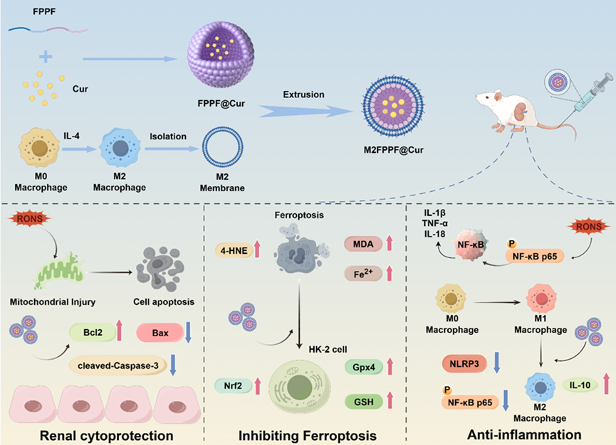 Ferrostatin-1(Fer-1)通过4-羧基苯硼酸(4-PBA)和岩藻多糖(Fuc)与姜黄素(Cur)组装,构建ROS响应纳米递送系统(FPPF@Cur),进一步涂覆M2巨噬细胞膜(M2M)形成多功能仿生纳米RONS清除剂(M2FPPF@Cur),设计用于将Cur靶向递送到受伤的肾脏。相关成果以“Biomimetic Reactive Oxygen/ Nitrogen nanoscavengers inhibit “ferroptosis storm” and modulate immune targeting for acute kidney injury”为题发表在药剂学著名期刊《Journal of Controlled Release》(1区TOP期刊,IF=10.5)上,硕士研究生曹玉昕、刘晓伟为论文的共同第一作者,陈大全教授为论文的通讯作者。相关工作得到了山东省泰山学者计划、山东省自然科学基金重大基础研究等项目的支持。