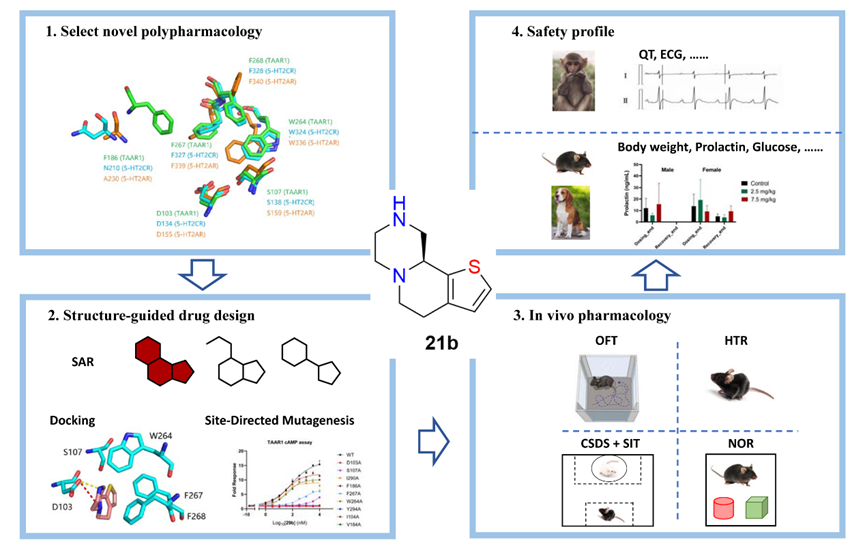近日,欧冠官网中文版药学院/分子药理和药物评价教育部重点实验室田京伟/张剑钊/芦静团队与绿叶制药集团创新研究院,首次发现微量胺相关受体1 (Trace-amine associated receptor 1, TAAR1)和5-HT2C受体(5-hydroxytryptamine receptor 2C, 5-HT2CR)的相似结合模式,用于新一代治疗精分药物/阿尔茨海默病精神病性障碍等疾病研发。芦静带领药物设计团队基于人工智能药物设计和计算机辅助药物设计(AIDD/CADD)获得全球首个双靶点激动剂,表现出对TAAR1和5-HT2CR高特异性的强激动活性,在多种药效学模型展现出显著优于目前临床用药的特征;已在中国和美国进入临床I期多剂量递增(MAD)研究阶段,临床前和初步临床结果显示耐受性和安全性良好,未出现抗精分药物常见的锥体外系不良反应、血脂代谢异常、体重增加等副作用,被行业列为具有“重磅炸弹”潜力的分子。这一重要的科研成果不仅为精神分裂症和阿尔茨海默病精神病性障碍等患者提供了新的治疗选择,也为未来药物研发提供了创新策略。
