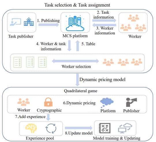 随着多空间网络架构和移动设备的发展,移动群智感知(MCS)已成为高效的数据采集方式,广泛应用于多空间智能感知、环境监测等场景。然而,现有MCS系统在任务分配与动态定价方面仍面临挑战:一是任务规模日益增长,异构实体能力差异显著,导致资源匹配效率低;二是传统定价策略难以应对异构实体的利益平衡,影响系统稳定性与激励效果。针对上述问题,王莹洁教授团队提出了一种融合博弈建模与深度强化学习的多目标任务分配与定价框架,显著提升了系统的智能决策能力与资源协同效率,系统架构如图1所示。