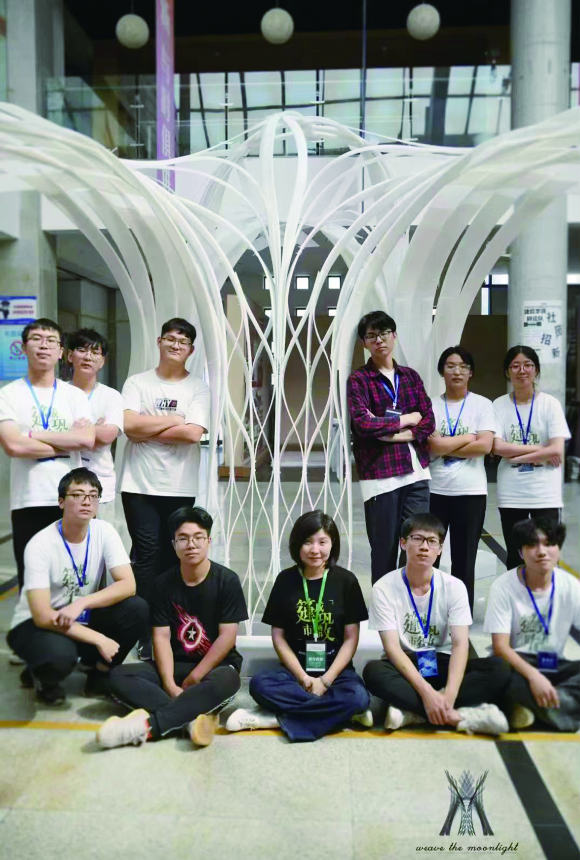 优秀作品《织·光》的完美呈现每个成员都发挥了重要作用,缺一不可。谈及作品,队长孙鑫说:“我们三人主创团队进行模型方案设计和把握搭建顺序,其他七名队员在我们的基础上进行辅助,大家都是我们的好帮手,最后我们合力完成了这个构造。”由于三人主创团队来自同一个工作室,由同一个老师带领,所以三人主创团队在思路和想法上很有默契,合作的进展也较为顺利。团队成员们各司其职,经历了漫长的方案讨论和模型制作,最后确定了建筑的拱劵形式。在正式搭建之前,孙鑫、李超然、田鑫蕊三人作为团队主力对所有的板材进行预制切割,包括多次的模型制作和结构测量。大家充分发挥自己的优势,相互信任,各尽其责,很多难解的问题都迎刃而解。
