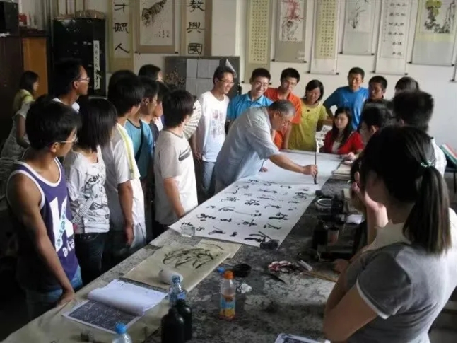 说到书画协会,那就不得不提到其中的灵魂人物——韩冬冰老师。如果把韩老师比作太阳,那同学们就是被温暖光芒不断照耀的行星。每至清晨或傍晚,在大学生活动中心,总能看到一道靓丽的风景线——许多学生团团簇拥在韩老师身边,一路跟随他,聆听他……
