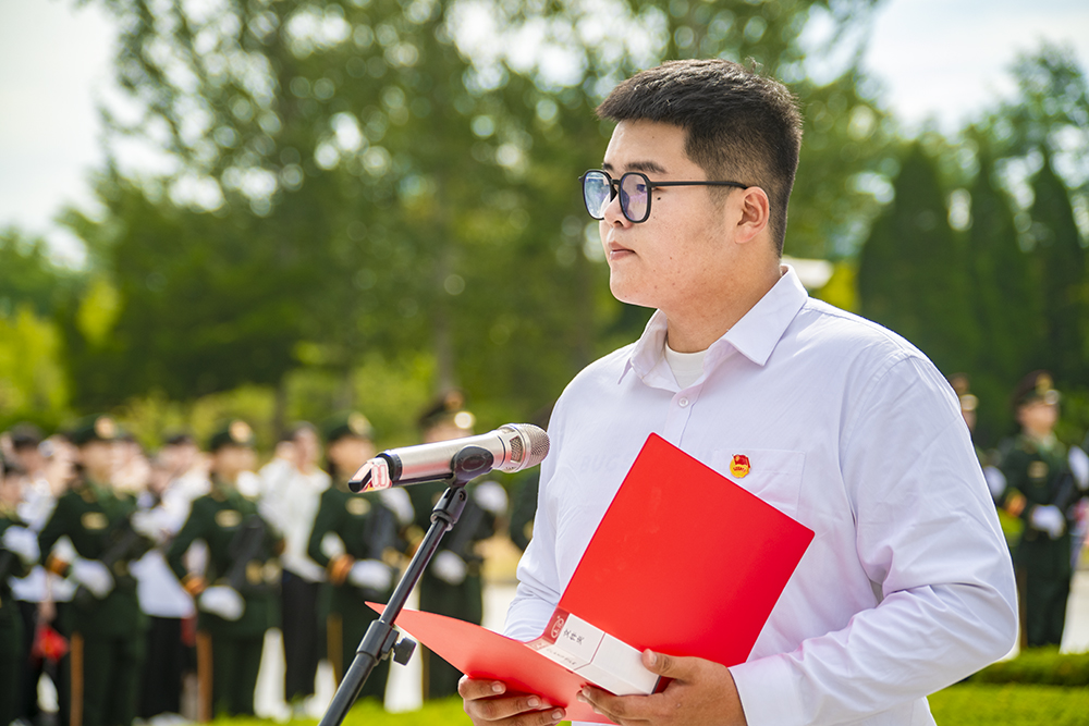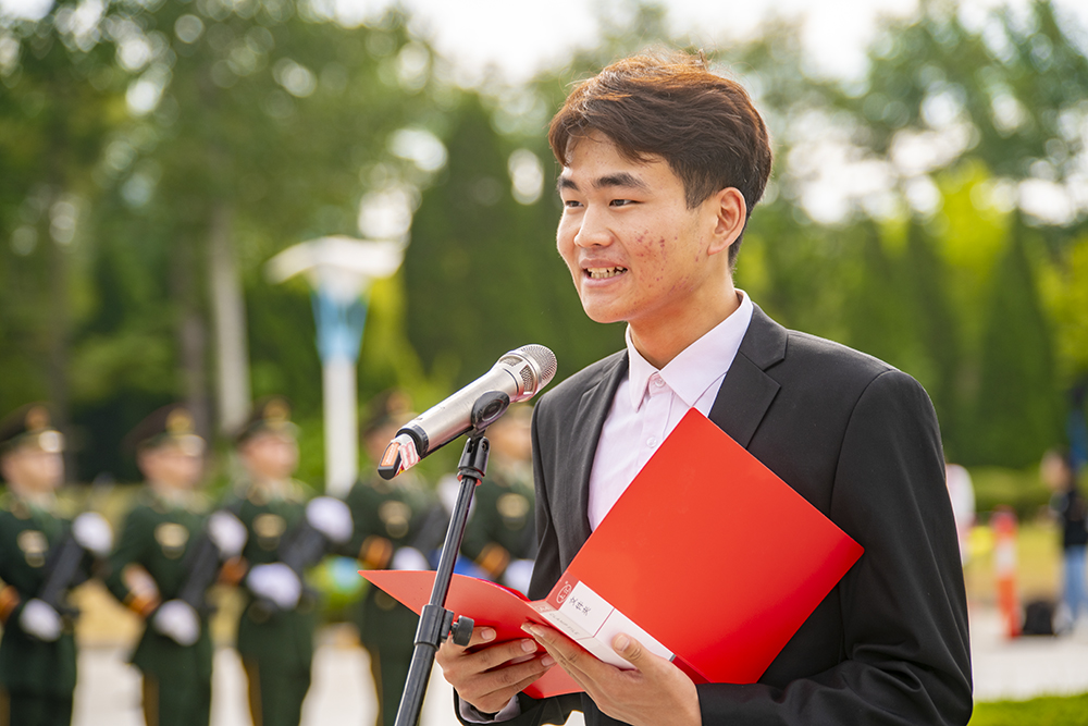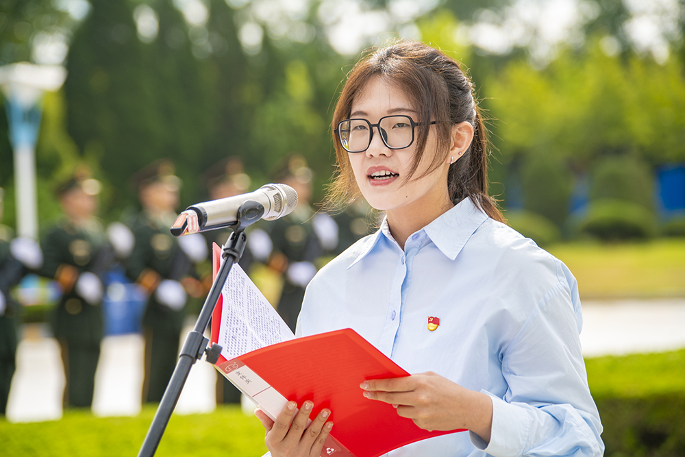 “我以青春的名义,庄严宣誓:热爱我的祖国,紧跟党的步伐,做祖国母亲忠实的拥护者,坚持‘守信、求实、好学、力行的校训……”学生代表、化学化工学院2020级高分子材料与工程专业马晓宇同学带领现场学生代表在鲜艳的五星红旗下庄严宣誓。