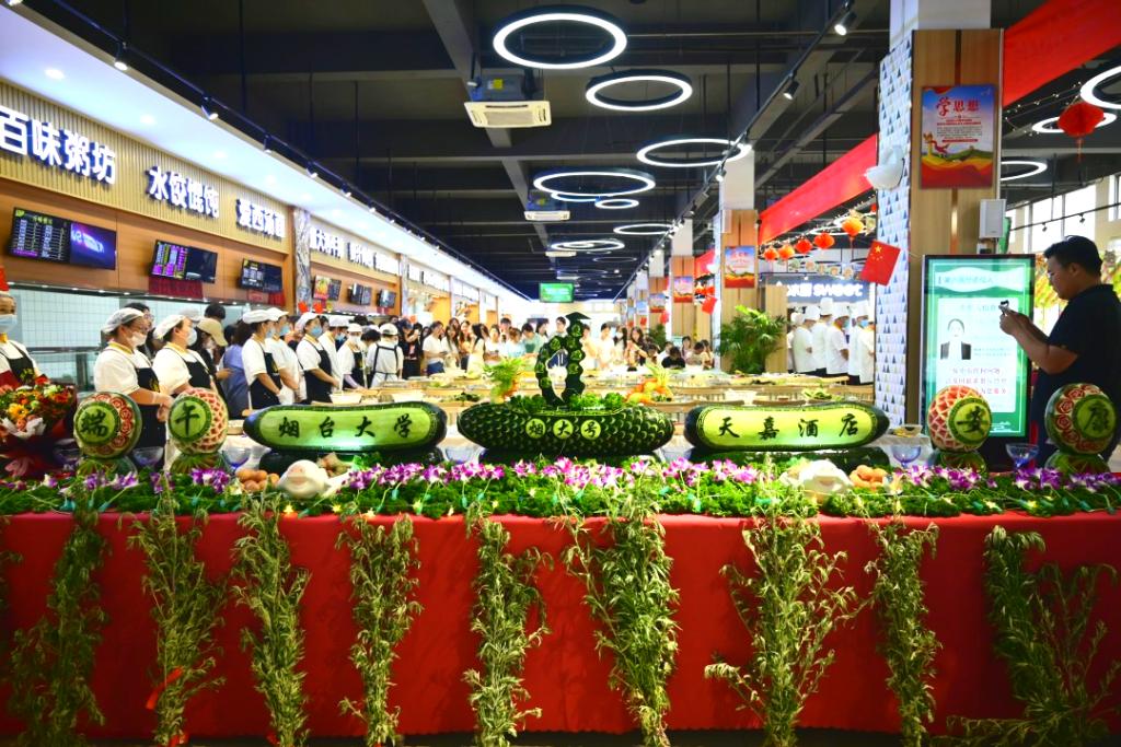 一进餐厅门,大家的目光便被左手边桌上摆放的各式“果蔬雕塑”所吸引——带着“乘风破浪 扬帆起航”字样的“烟大号”冬瓜龙舟居于C位,平日里常见的西瓜摇身一变,穿上“新衣”,带着精巧的纹路立在两边,向师生们送去“端午安康”的节日祝福。“有趣又温馨!这是我第一次在烟大过端午节,真的很有家的感觉......”来自法学院的22级学生时玙璠一边说着,一边正从各个角度不停拍下照片,“群发”着这份喜悦。
