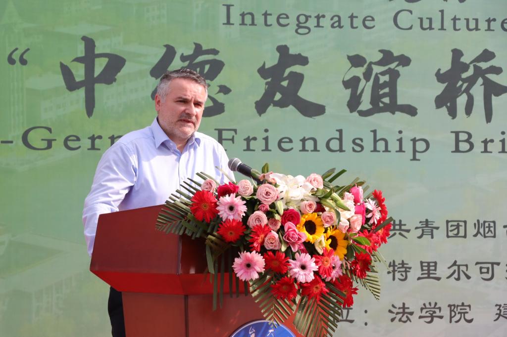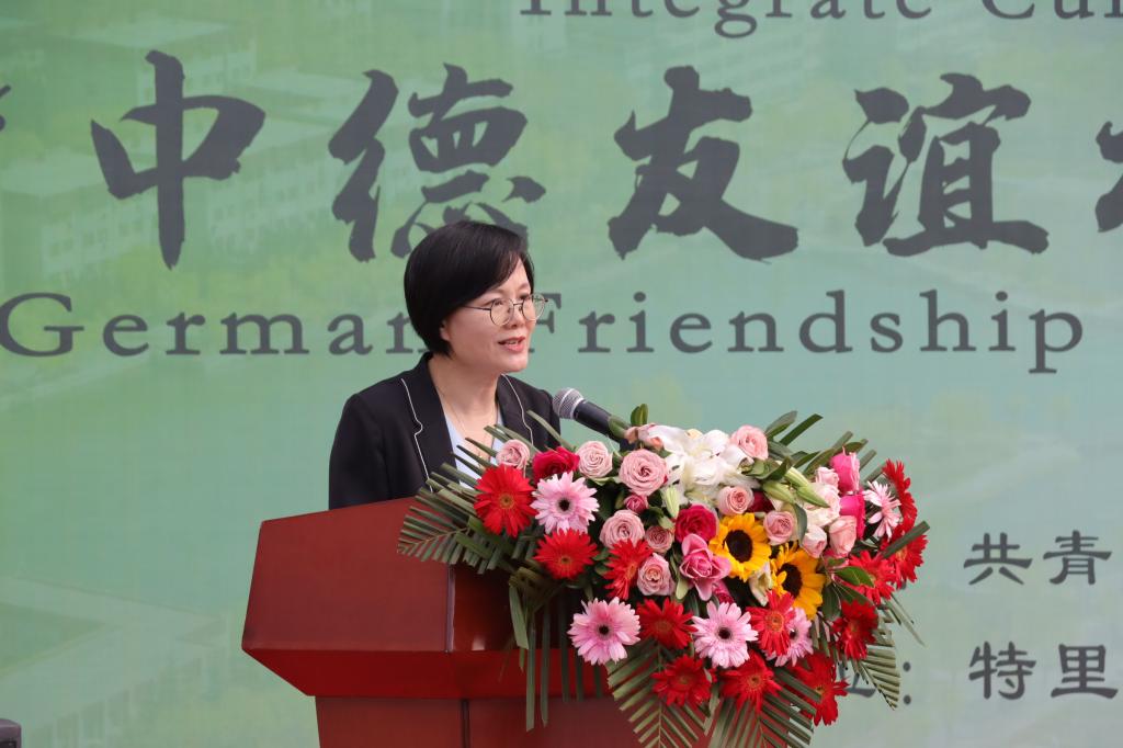 【本站讯】四载耕耘,绿韵流芳。6月5日,学校第四届“中德友谊桥”文化交流节在育秀广场举行。党委常委、副校长冯素玲,德国特里尔应用技术大学国际项目管理部门负责人Marco Angilella教授出席开幕式并致辞,学生工作处、校团委、国际合作交流处、法学院、环境材料工程学院、特里尔可持续发展技术学院等单位负责人参加活动。
