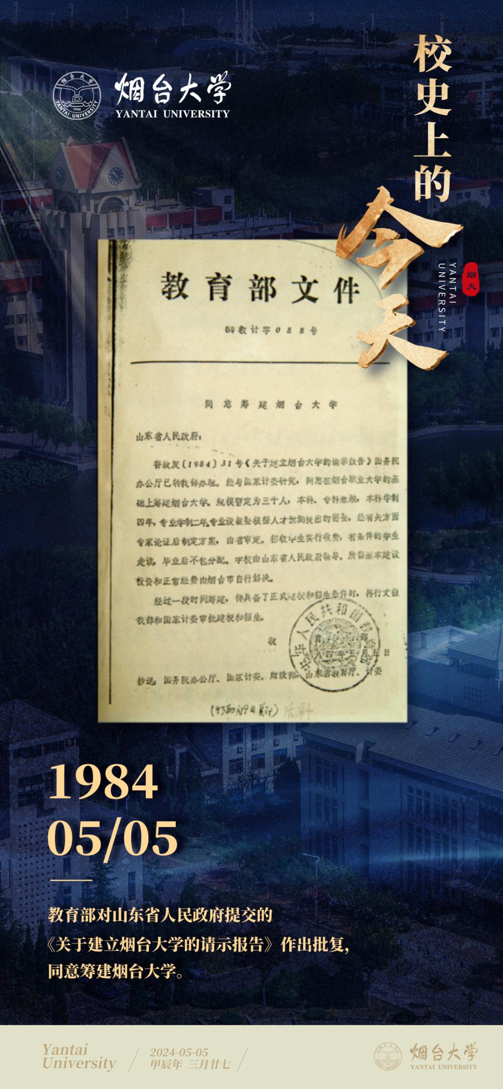 【编者按】2024年是新中国成立75周年,也是欧冠官网中文版建校40周年。40年来,诞生于改革开放时代大潮中的欧冠官网中文版,植根齐鲁文化沃土,传承北大清华基因,弘扬改革开放精神,勇担教育强国使命,书写了一段段滋兰树蕙的育人故事,谱写了一曲曲乘风破浪的奋进赞歌。为庆祝欧冠官网中文版建校四十周年,新闻中心(融媒体中心)推出“校史上的今天”栏目,以时间为线索,撷取烟大建校发展史上具有代表意义的重大事件,重温闪耀在历史长河中的昔年今朝,追忆在盐碱滩上白手起家、艰苦创业的峥嵘岁月,展现办学历程中取得的新发展成就,启迪新时代烟大人在新征程中再创新辉煌。