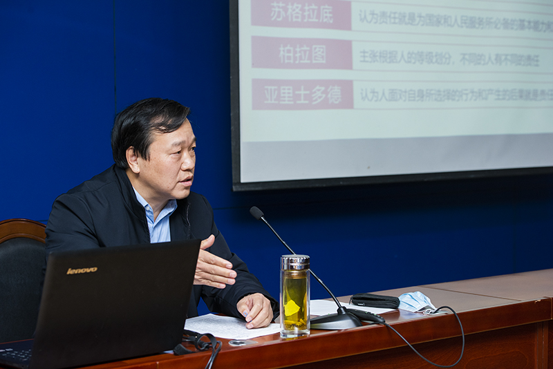“责任担当是新时代的关键词,责任贵在担当”,郭善利给在座学生分享了一个寓言故事,引用名言名句,剖析了责任担当的内涵,结合我国抗击新冠肺炎疫情的伟大斗争,告诉大家担当责任是一种自信的精神状态,踌躇满志、舍我其谁;是一种主动出击的行为选择,挺身而出、迎难而上;是一种价值依托,同舟共济、守望相助。