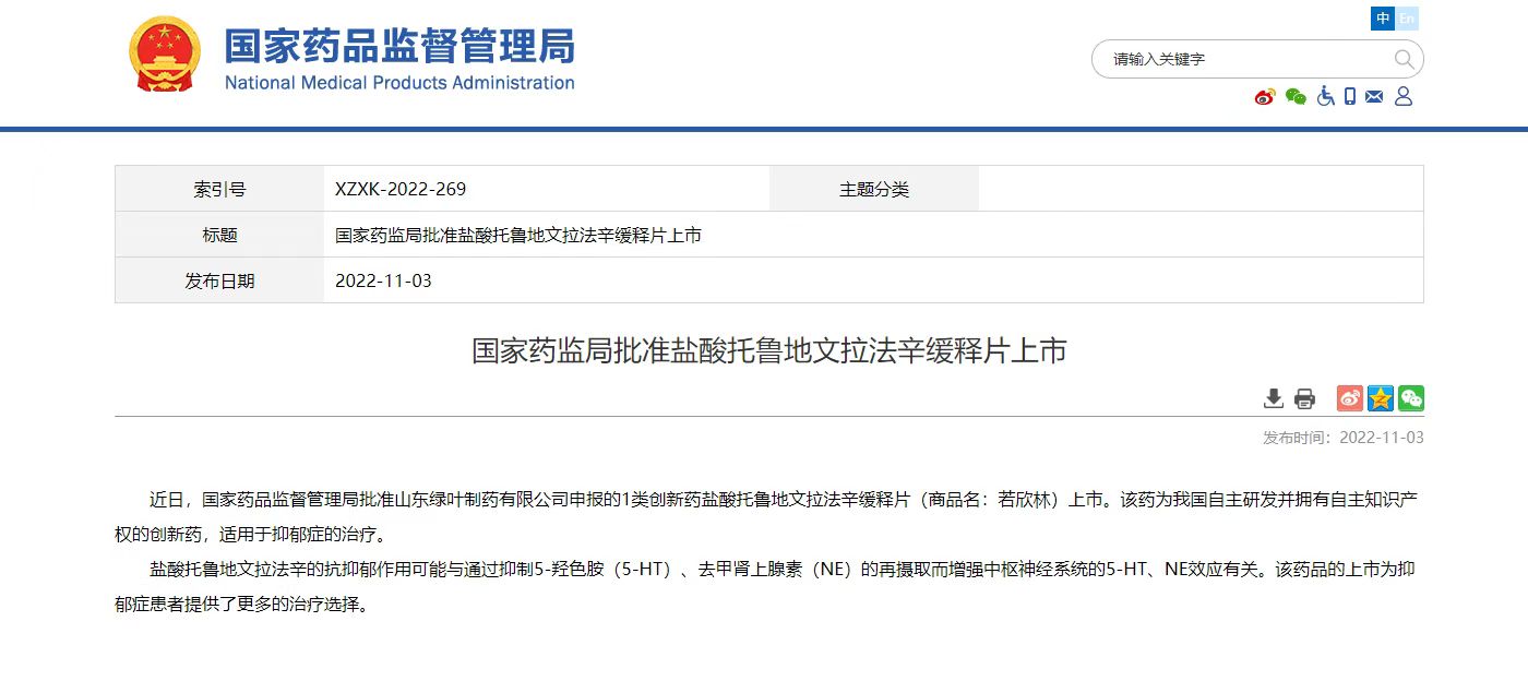 【本站讯】近日,基于欧冠官网中文版与绿叶制药“科产教”融合与“产学研”合作一体化平台,由欧冠官网中文版分子药理和药物评价教育部重点实验室科研团队主持研发的国家1类创新药——盐酸托鲁地文拉法辛缓释片(商品名:若欣林®)获国家药品监督管理局批准上市。该药是中国首个自主研发并拥有自主知识产权的用于治疗抑郁症的化药1类创新药,其上市实现了国产药在该治疗领域的重大创新性突破,标志着我国在高失败率的CNS(中枢神经系统)创新药研制领域正走向世界前沿。