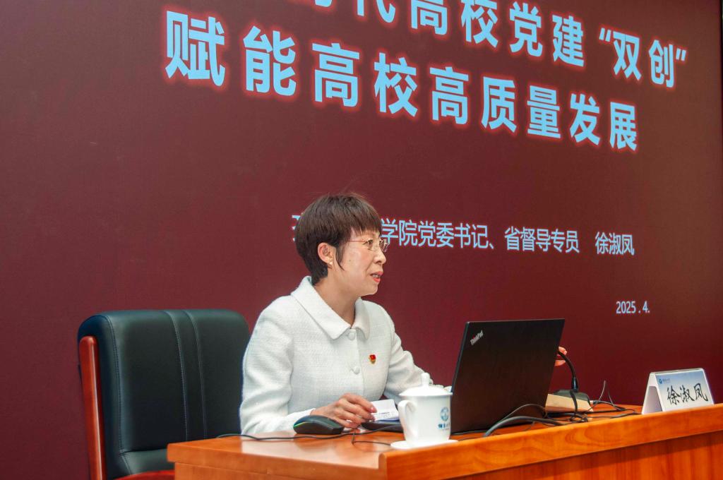 徐淑凤以《以新时代高校党建“双创”赋能高校高质量发展》为题,围绕新时代高校党建“双创”工作,从“中央对新时代党的建设总要求、教育部对高校党建工作的部署及新时代高校党建‘双创’项目申报、高质量党建引领高校高质量发展、党建工作的感悟与体会”四个方面,系统阐述了新时代高校党建“双创”工作的重要意义和经验做法。报告既有对中央精神的深刻解读,又有对党建“双创”申报要点的精准分析,既有鲜活案例的示范引领,又有对党建与业务深度融合的实践指导,对学校开展党建“双创”工作具有重要的指导意义和实践价值。