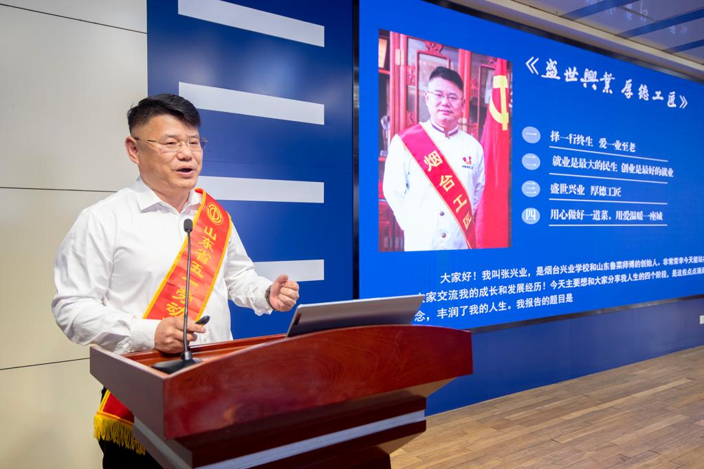 宣讲中,崔力元通过回顾烟台发展历程中不同时期的劳模事迹,结合自身对劳动精神的理解,指出劳动精神经历了从“追跑”“并跑”再到“领跑”的时代发展,阐述了“劳动最光荣、劳动最崇高、劳动最伟大、劳动最美丽”的价值内涵。张兴业以“盛世兴业,厚德工匠”为主题,讲述自己“出身草根,拼搏不息”的成长历程和“孜孜奉献,感恩前行”的创业故事,展现了自强不息、追求卓越、勇攀高峰的拼搏精神。曹园媛分享了自己扎根海岛13年的心路历程,讲述了爱的接力的故事,展现了一位基层工作者在平凡岗位上的坚守,用实际行动诠释了感恩、热爱和责任。