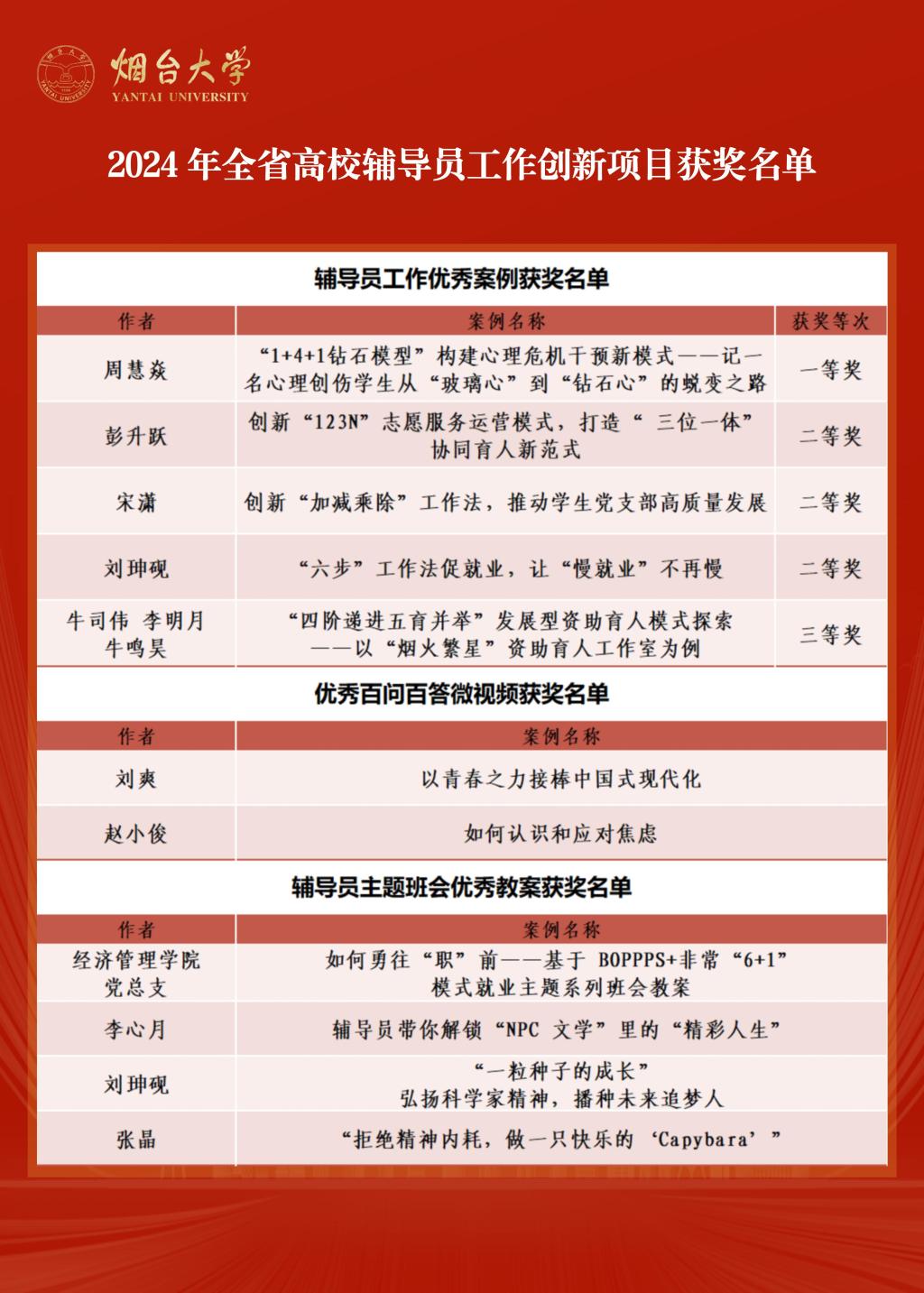 【本站讯】4月29日,中共山东省委教育工委公布了2024年全省高校辅导员工作创新项目评选结果,欧冠官网中文版共获奖11项,其中辅导员工作优秀案例一等奖1项、二等奖3项、三等奖1项,优秀百问百答微视频2项,辅导员主题班会优秀教案集体项目1项、个人项目3项。