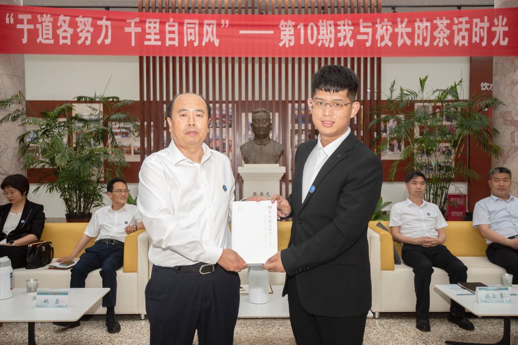 【本站讯】“我来自一个经济困难家庭,是国家和学校的奖助政策照亮了我的求学之路,让我相信寒门学子也能绽放光芒”“从四度折戟的论文低谷到文章被SCI一区期刊录用的曙光初现,是导师的鼓励点燃了我的坚持,让我叩开了名校博士研究生之门”……6月11日下午,承先图书馆二楼大厅气氛温馨融洽,充满欢声笑语,第10期“我与校长的茶话时光”(毕业季专场)活动在此举行。来自21个学院的本科毕业生和研究生毕业生代表与学校领导围坐一堂,共话成长历程,畅谈未来理想,为母校发展建言献策。党委副书记、校长郝曙光,党委常委、副校长冯素玲、姚昌、张献勇、王丽、初磊出席活动并为毕业生送上祝福。活动由冯素玲主持。