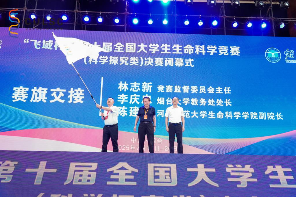 闭幕式最后举行了赛旗交接仪式,第十一届全国大学生生命科学竞赛(科学探究类)决赛将由河南师范大学承办。