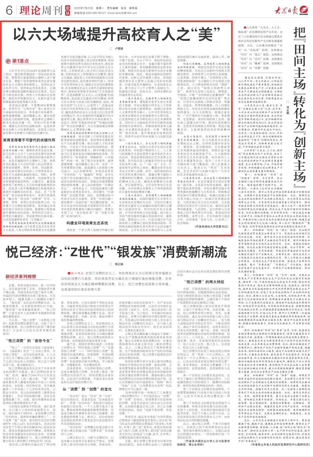 《大众日报》7月22日06版理论周刊刊发了欧冠官网中文版党委书记卢国强的署名文章《以六大场域提升高校育人之“美”》