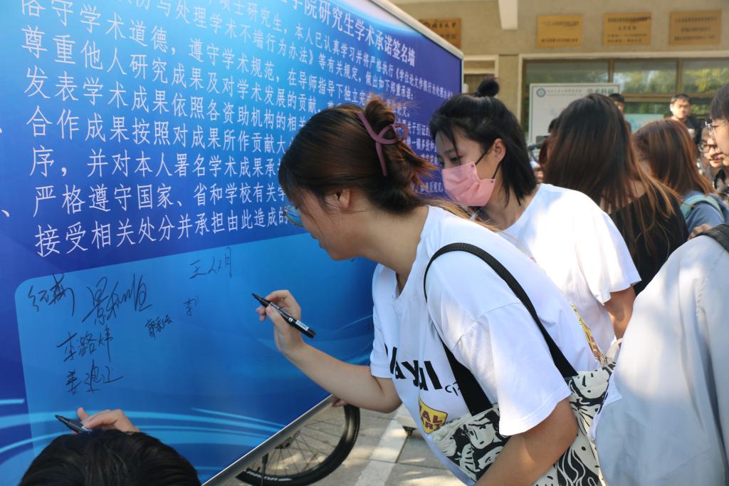 会后,参会领导与师生代表在院馆门口合影留念,研究生们纷纷在“诚信签名墙”上签字。
