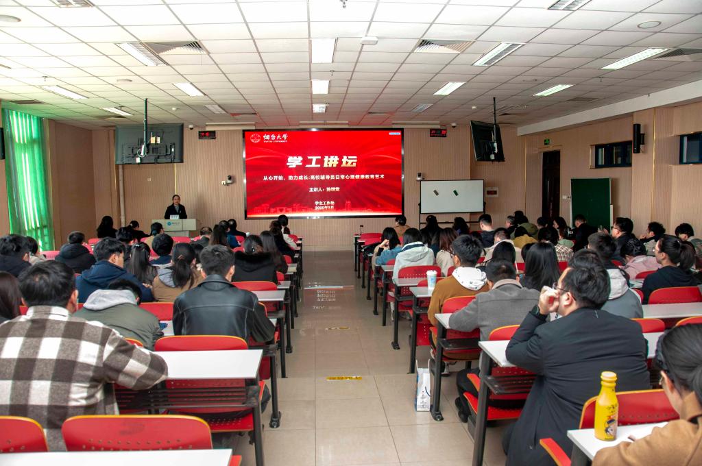 【本站讯】为落实立德树人根本任务,提升辅导员心理健康教育工作水平和能力,3月20日下午,学校举办2025年第一期学工讲坛。同济大学心理健康教育与咨询中心陈增堂教授作专题辅导报告,各学院党组织副书记、全体辅导员参加活动,正处级组织员周娟主持本次讲坛。