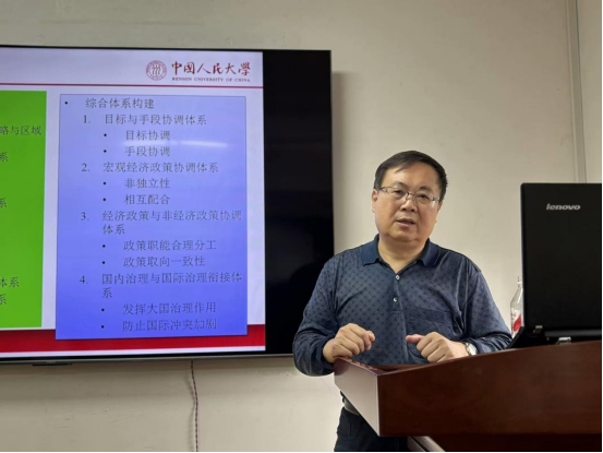 刘瑞教授基于历史演化的角度,围绕宏观经济治理体系的构建与在场师生展开探讨。他为大家详细解读了宏观经济治理体系的概念,并介绍了现代化的宏观经济治理体系,系统梳理了经济体系的演化。刘瑞教授着重介绍了单独体系构建与综合体系构建,从历史演化的角度来帮助大家深刻理解宏观经济治理体系构建。他鼓励同学们要多角度、全方位地发现问题、解决问题,在学术科研的道路上积极探索。