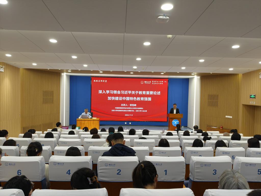 为庆祝欧冠官网中文版建校40周年,马克思主义学院于11月9日邀请中国高等教育学会马克思主义研究分会理事长、北京大学校务委员会副主任兼秘书长、北京大学工会主席安钰峰作客两校名师讲堂,做了题为“深入学习领会习近平关于教育重要论述 加快建设中国特色教育强国”的学术报告。报告由马克思主义学院党总支书记李祎主持,学院师生100余人参加会议。