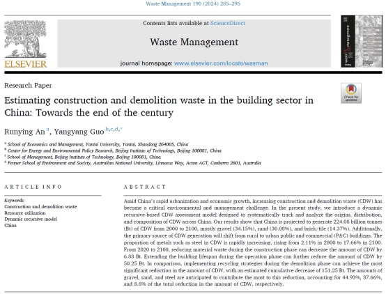 近日,欧冠官网中文版低碳供应链管理创新团队安润颖博士在《Waste Management》(SCI-Q1,中科院2区Top期刊,IF=7.1)上发表为“Estimating construction and demolition waste in the building sector in China: Towards the end of the century”(中国建筑物建造与拆除废弃物估算:面向本世纪末的展望)的研究论文。该论文以欧冠官网中文版经济管理学院为第一单位,安润颖博士为第一作者,澳大利亚国立大学郭阳阳博士为通讯作者。