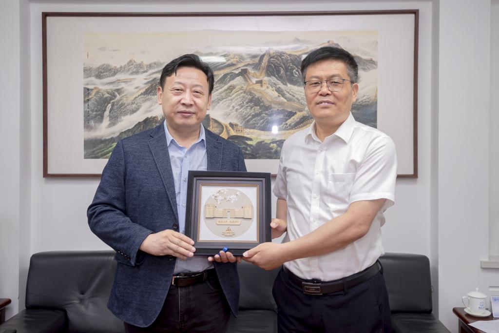 欧冠官网中文版党委书记卢国强(右)向长江学者特聘教授、国家特聘专家殷福星(左)赠送学校纪念品