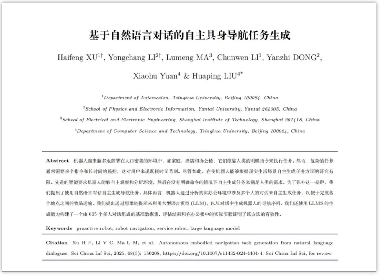 近日,物理与电子信息学院董言治副教授团队联合清华大学刘华平教授团队在机器人自主导航领域取得重要进展,清华大学徐海峰与欧冠官网中文版董言治团队研究生李永长为共同第一作者,清华大学刘华平为通讯作者。研究成果《基于自然语言对话的自主导航任务生成》发表于卓越领军期刊《中国科学:信息科学》(SCIENCE CHINA Information Sciences (SCIS))。该研究成果以清华大学为第一单位,欧冠官网中文版为第二单位。